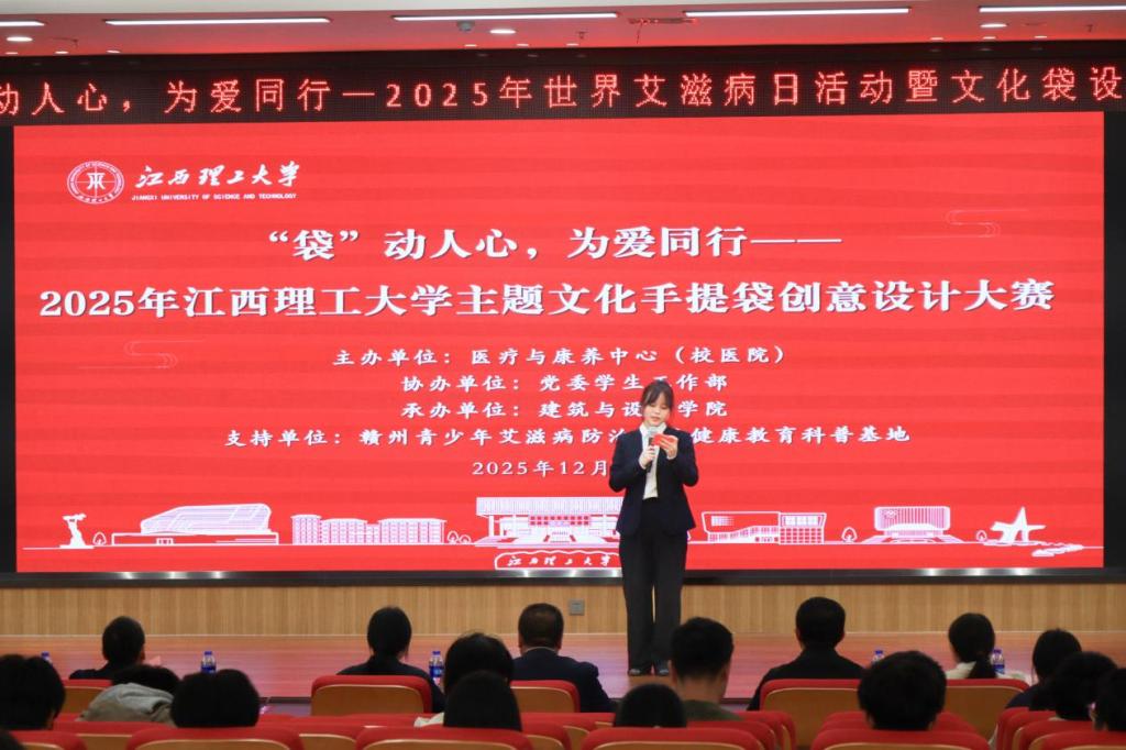 Online News Report: On December 2, the "'Bags' Touch Hearts, Walk Together with Love" — 2025 Jiangxi University of Science and Technology Themed Cultural Tote Bag Creative Design Competition, hosted by our college, was held in the university library. This event also served as a public education activity for the 2025 World AIDS Day at the university. Sponsored by the University Medical and Healthcare Center (University Hospital), co-organized by the Student Affairs Office, and undertaken by the College of Architecture and Design, the competition was attended by Yang Rongrong, Section Chief of the AIDS Prevention Section of Ganzhou Center for Disease Control and Prevention; Zhou Maoping, Dean of the University Hospital; Liu Liming, Deputy Director of the Student Affairs Office; Long Ping, Deputy Secretary of the University Youth League Committee; Liu Xianpeng, Deputy Secretary of the Party Committee of the College of Architecture and Design; Liu Duanxiang, Dean Assistant of the University Hospital; and Guo Wenzhan, Teacher of the College of Architecture and Design, along with contest participants and student representatives.